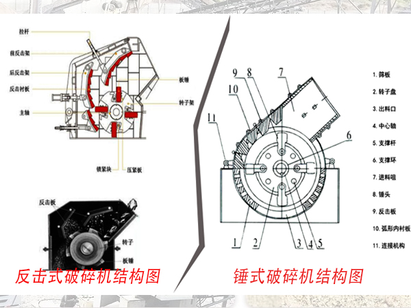 1、反擊式破碎機(jī)出料口大小可以調(diào)節(jié),錘式破碎機(jī)需要更換底部篩板來調(diào)節(jié)。